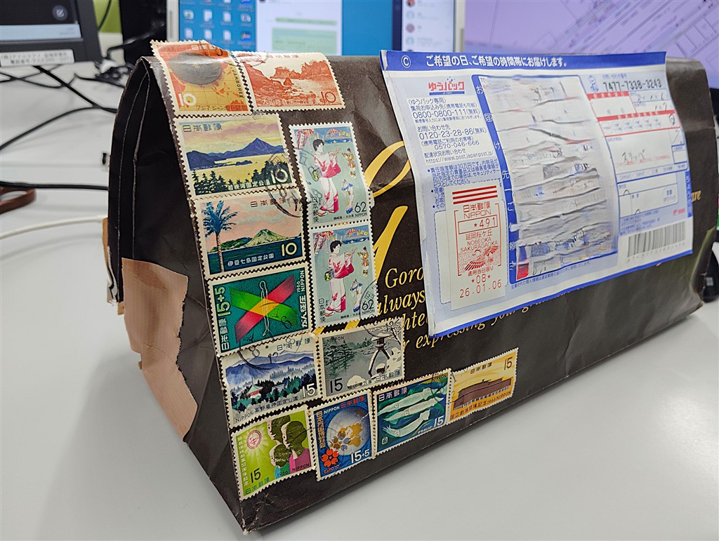 送られてきた小包かっこよすぎる。僕には切手への嗜好がないんだけど、眺めてて楽しくなる切手の絵柄、剥がれかかった切手、しっかりと仕事してるガムテ、この小包の雰囲気…